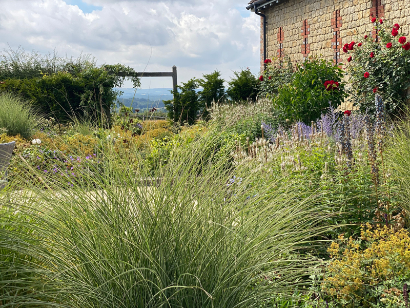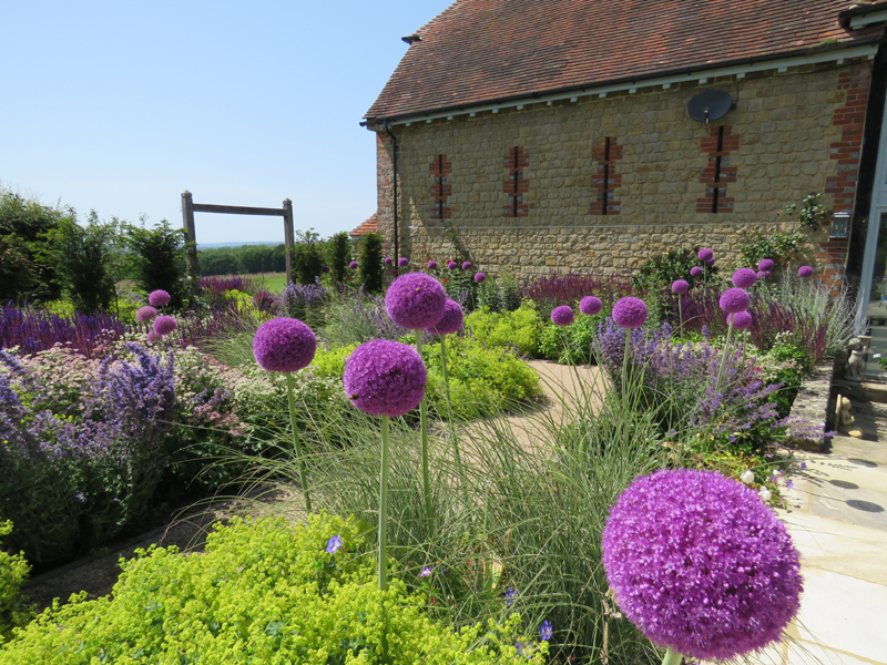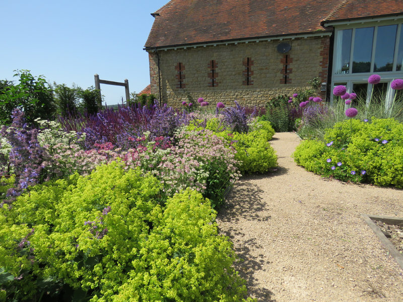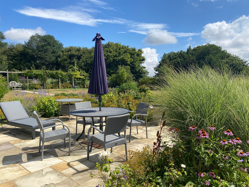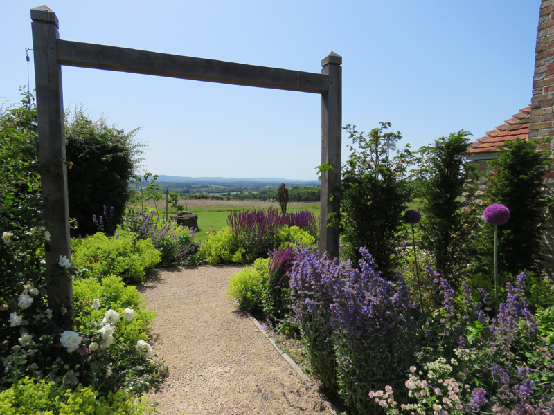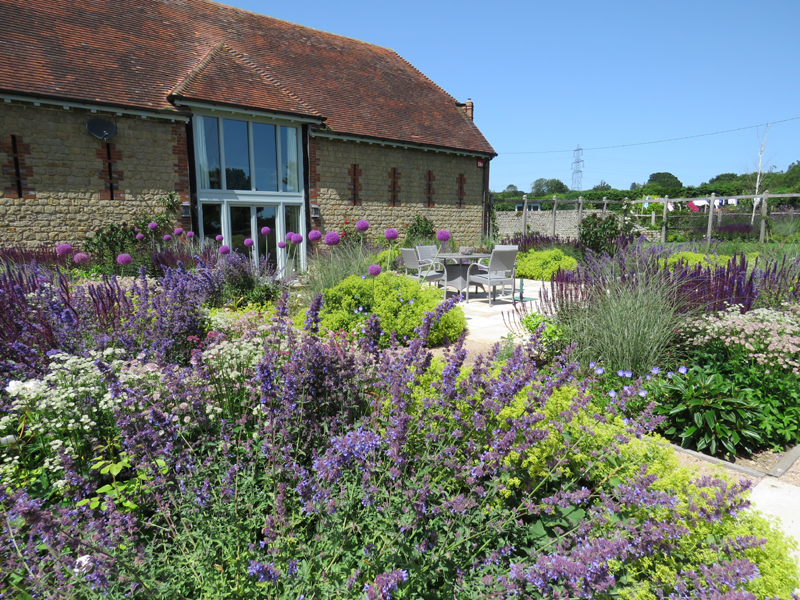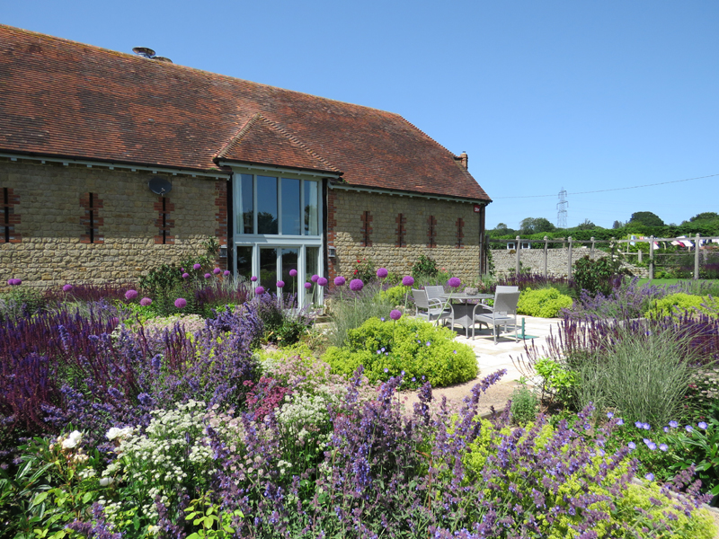 My clients had bought a beautiful barn on top of the downs with far-reaching views. The surrounding gardens had been laid to lawn and paddock and we kept one side of the garden with grass and meadow planting to retain the views and feel of the surrounding countryside. Our client also wanted a 'proper' garden with places to sit out of the wind, with flowers and formal borders so we designed and built another area, contained by yew hedging and tall oak pergolas with wide planting beds and paths. A small summerhouse sits within a courtyard area. We planted the pergolas with roses and clematis which have now grown over the structures, creating a sense of enclosure. Regular maintenance has really worked well for this garden, enabling the planting to retain a blowsy romantic feel.