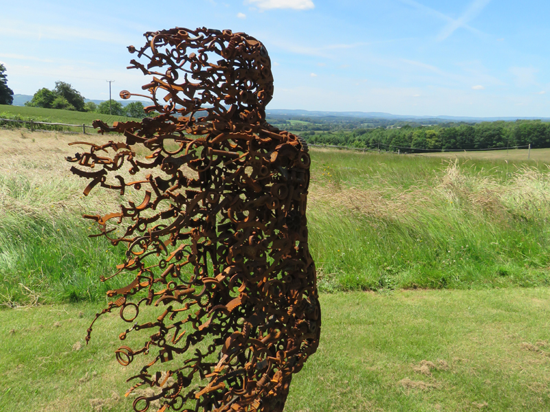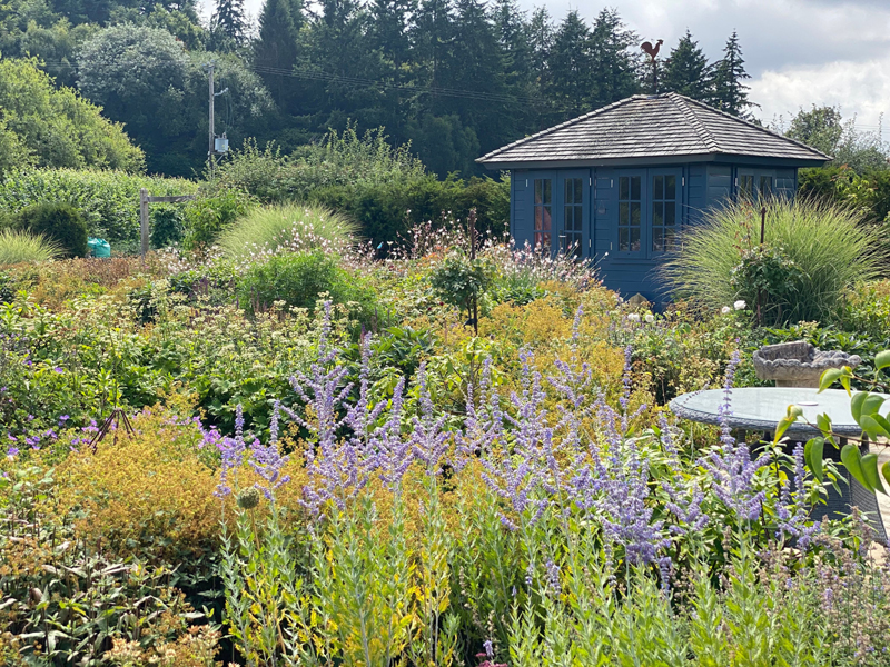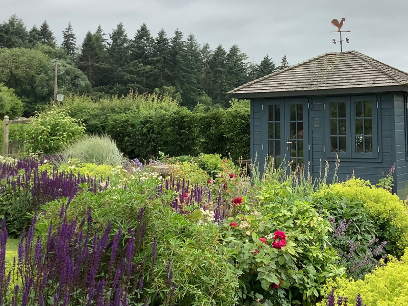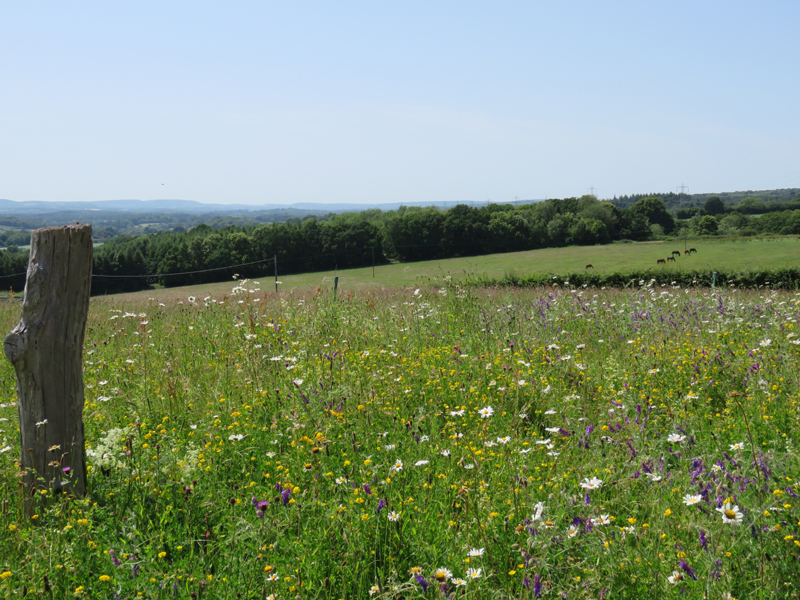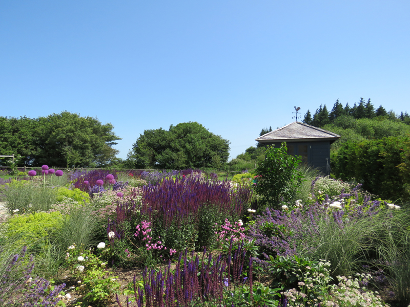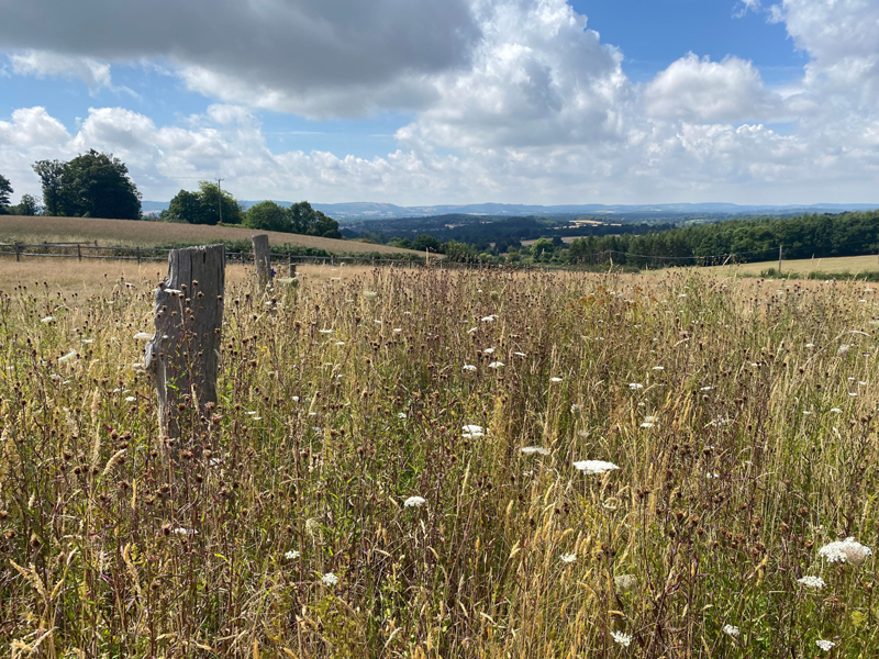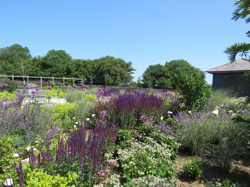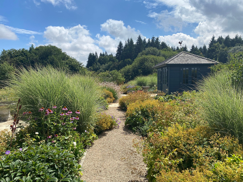 My clients had bought a beautiful barn on top of the downs with far-reaching views. The surrounding gardens had been laid to lawn and paddock and we kept one side of the garden with grass and meadow planting to retain the views and feel of the surrounding countryside. Our client also wanted a 'proper' garden with places to sit out of the wind, with flowers and formal borders so we designed and built another area, contained by yew hedging and tall oak pergolas with wide planting beds and paths. A small summerhouse sits within a courtyard area. We planted the pergolas with roses and clematis which have now grown over the structures, creating a sense of enclosure. Regular maintenance has really worked well for this garden, enabling the planting to retain a blowsy romantic feel.